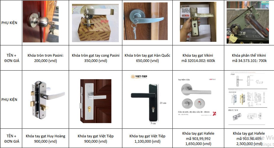 - Khóa tay gạt Vickini: 600.000d/bộ