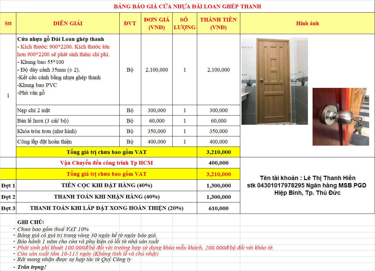 Mời bạn tham khảo bảng giá cửa nhựa Đài Loan ghép thanh: