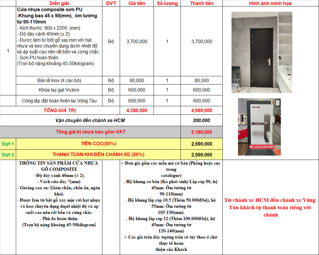 -Cửa nhựa Composite 1 bộ gồm: Giá cửa +nẹp chỉ+phụ kiện+lắp đặt + vận chuyển( nếu có).