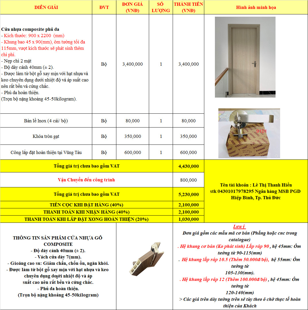 - Cửa có kích thước 990*2400: phát sinh thêm 40%/giá cửa ( gồm cánh, khung)